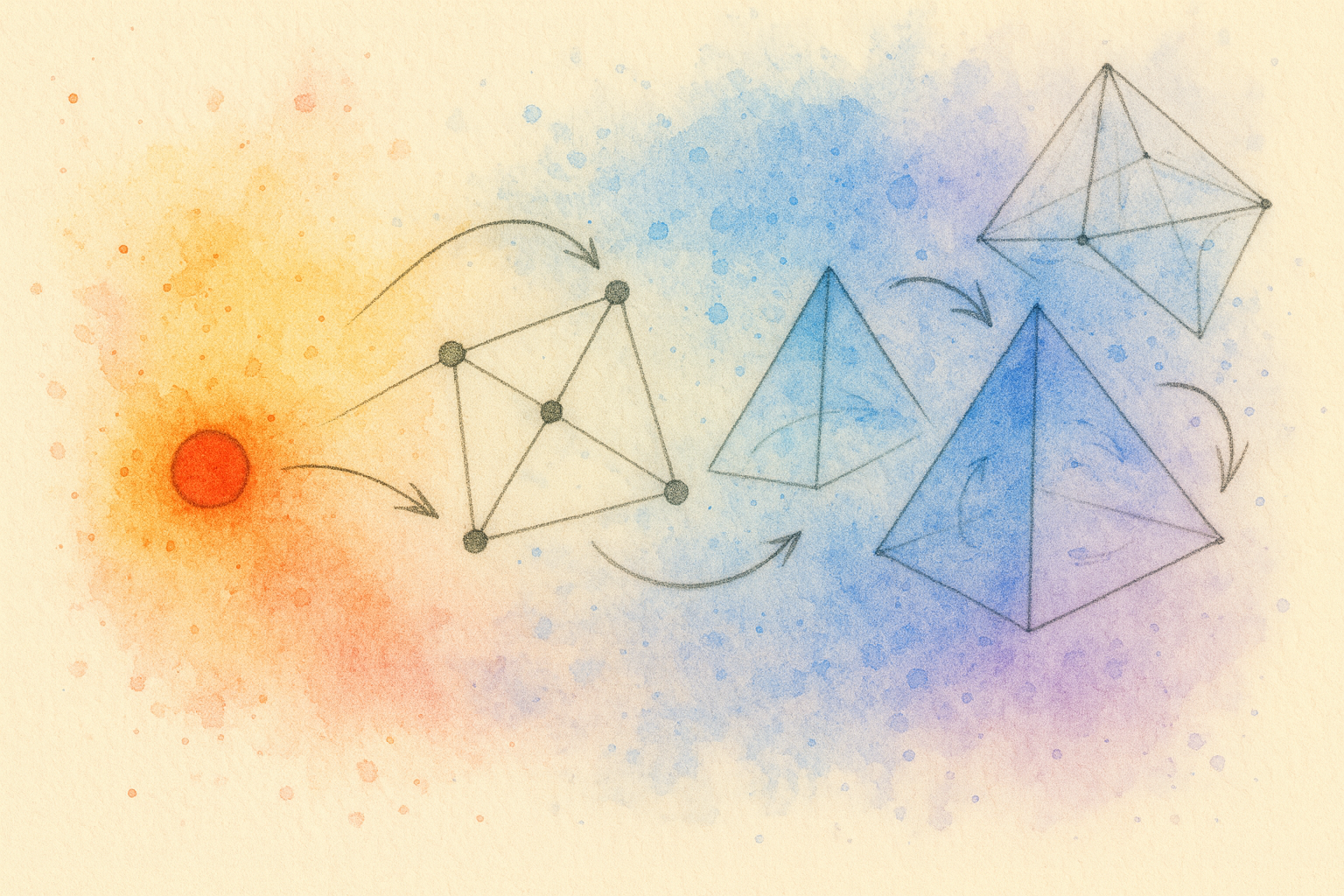 \[\mathcal{E}^{(k)} : \mathcal{V}^{k+1} \rightarrow \{0,1\}.\]Intuitively, this represents $k$-sized tuples of nodes. For example, for $k=2$, this is equivalent to all directed triangles between nodes, while the case $k=1$ recovers the original graph with pairwise links. Note, how, intuitively, for $\mathcal{E}^{(k)}$, we would be effectively considering $k$-dimensional geometric objects: nodes would be 0-dimensional points, edges 1-dimensional lines, triangles 2-dimensional surfaces, and so on (of course this is just an intuition, for this to be true we would need to embed our nodes in a space and require relations to be undirected).