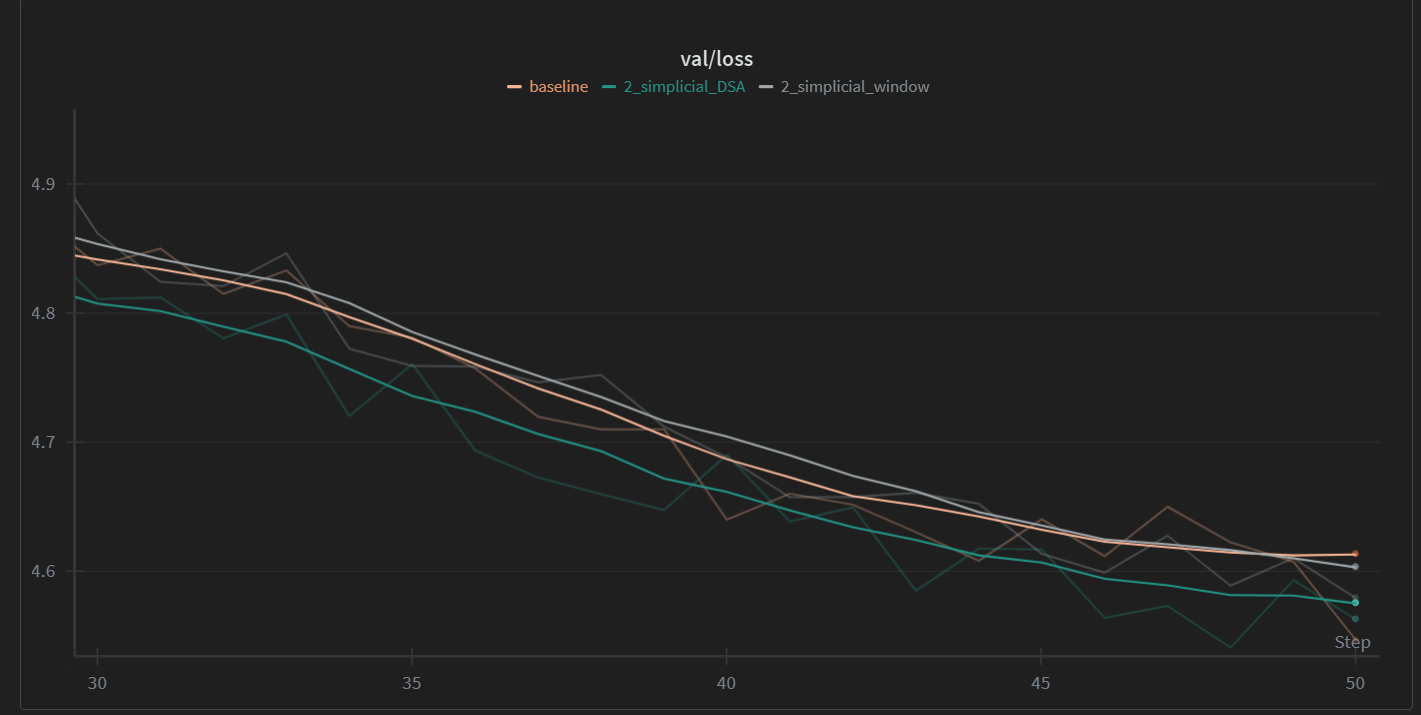 We’ve explored a recent advance in attention architecture, and explained it using our previously established topologically-oriented angle. We’ve also outlined a trivial extension to n-simplices of the mechanism, as well as demonstrated tiny gains in expressivity by utilizing a DSA-like sparsification of 2-simplicial attention keys, substituting SWA. Given my obsession with the topic, you’re very likely to read something from me on the topic soon. In the meantime, let me know what you think!