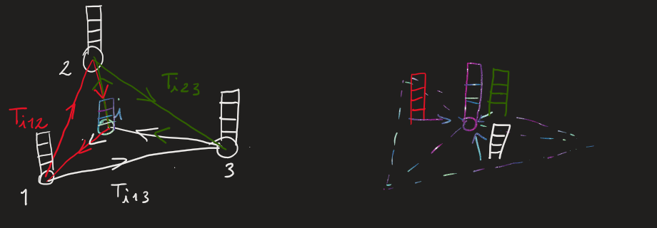 \[T_{ijk} = \langle q_i, k_j, k'_s \rangle\]Notice how, before, each attention score $A_{ij}$ represented the link weight going from node $i$ to node $j$. Now, each entry $T_{ijk}$ can instead be seen as the collective weight assigned to the triangle determined by the (directed) walk from node $i$, passing through node $j$, and ending up in node $k$.