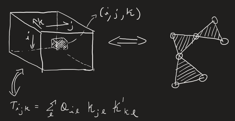 \[T_{ijk} = \sum_{l} Q_{il} K_{jl} K'_{kl}\]Which can also be seen as taking a multilinear product, if viewed per query: