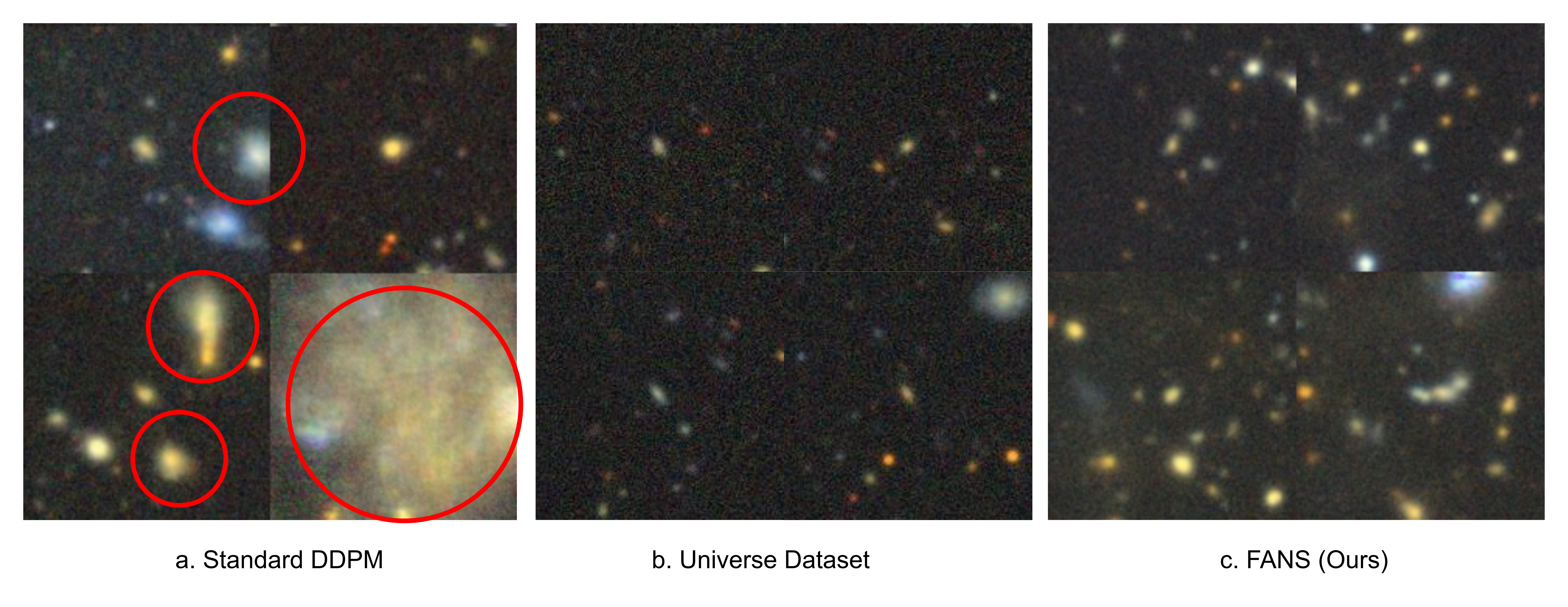 From the Figure we can see that FANS could capture the intricate details of the Multimodal Universe Dataset (FID: 10.003) while Baseline method couldn’t capture such intricacies (FID: 24.012). Similar observation can be made for the texture dataset. The baseline model intriduces a lot of atrifacts in the attempt to capture the texture details, while FANS could easilyt capture the intricate details of the dataset.