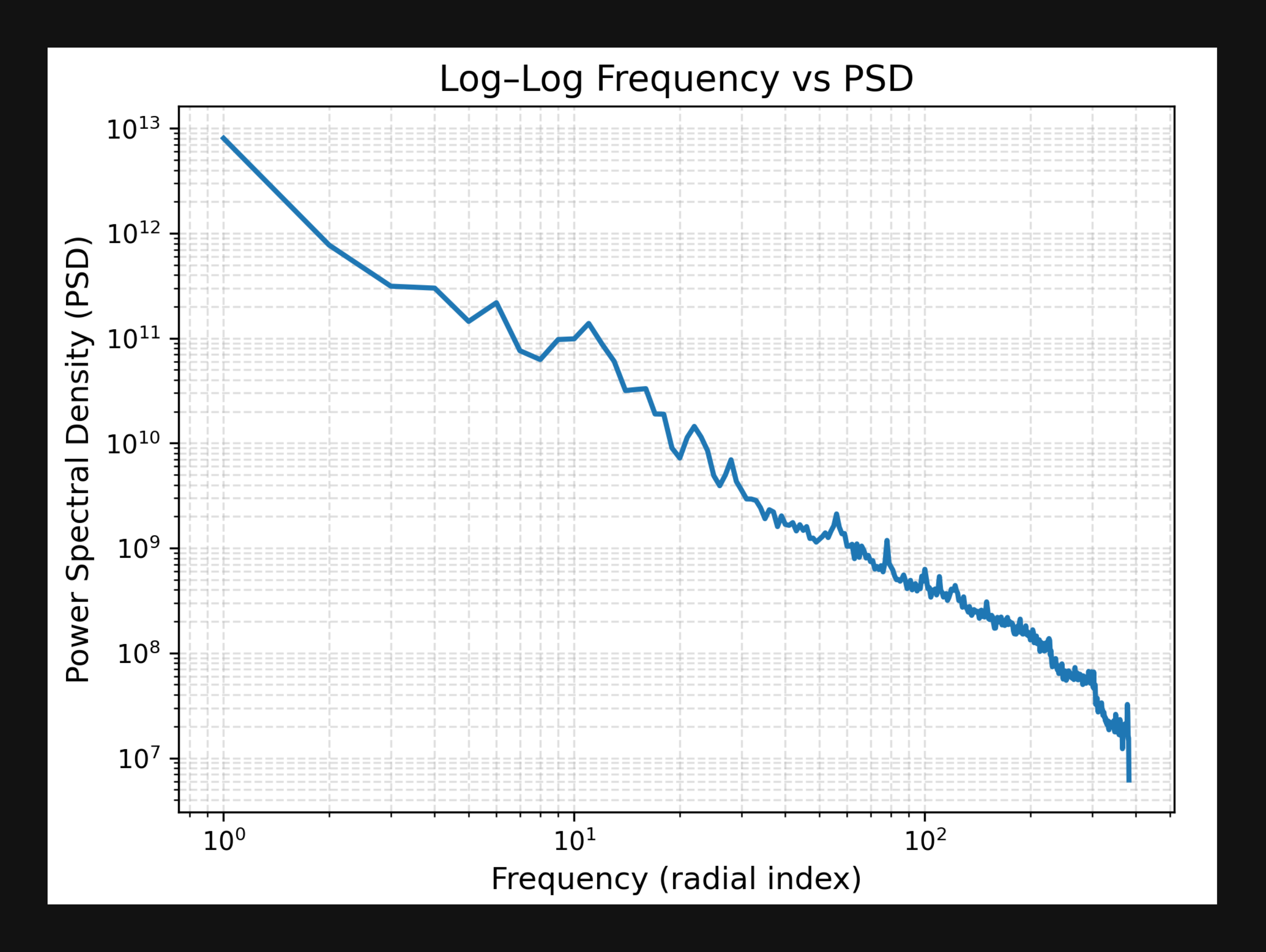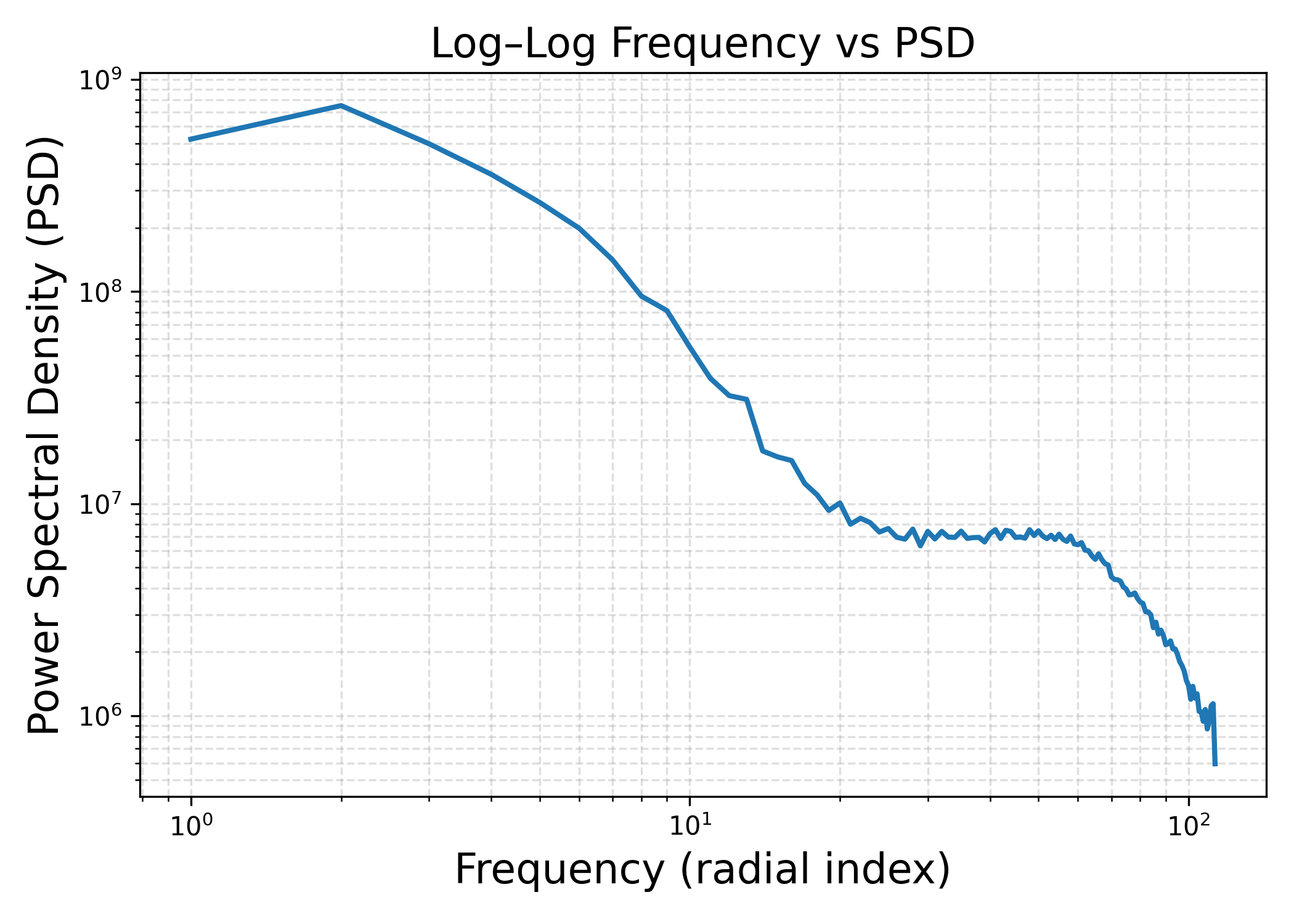 \[P(u,v) = |F(u,v)|^2\]representing the power at each frequency component. To get one dimensional spectral profile we compute the radially-average PSD by integrating over annular regions at constant radial frequency \(f\) (simply put we compute average power in ring-shaped zones moving outward from the center). Formally put