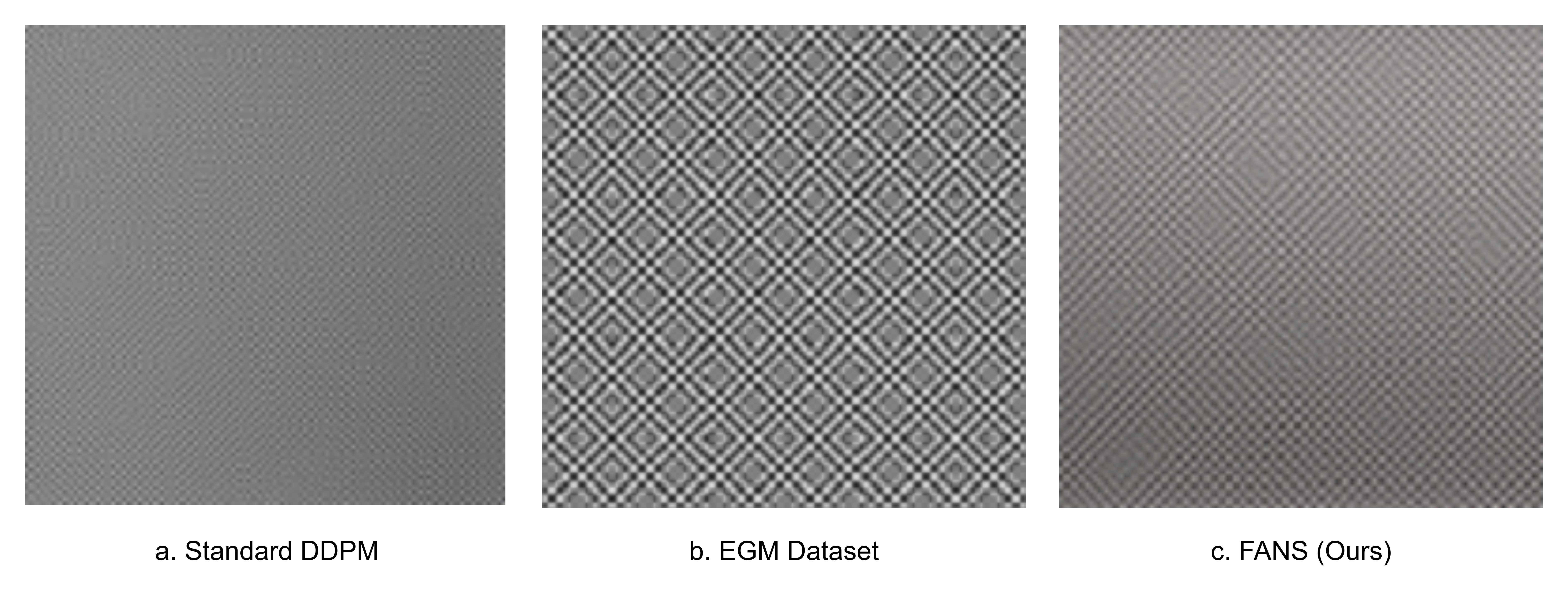 For EGM, both methods generate stable images, but FANS preserves fine-grained textures absent in DDPM outputs. Specifically, the characteristic cross-hatched patterns present in training data are preserved by FANS but smoothed out by DDPM. This suggests FANS better captures high-frequency components critical for texture fidelity.