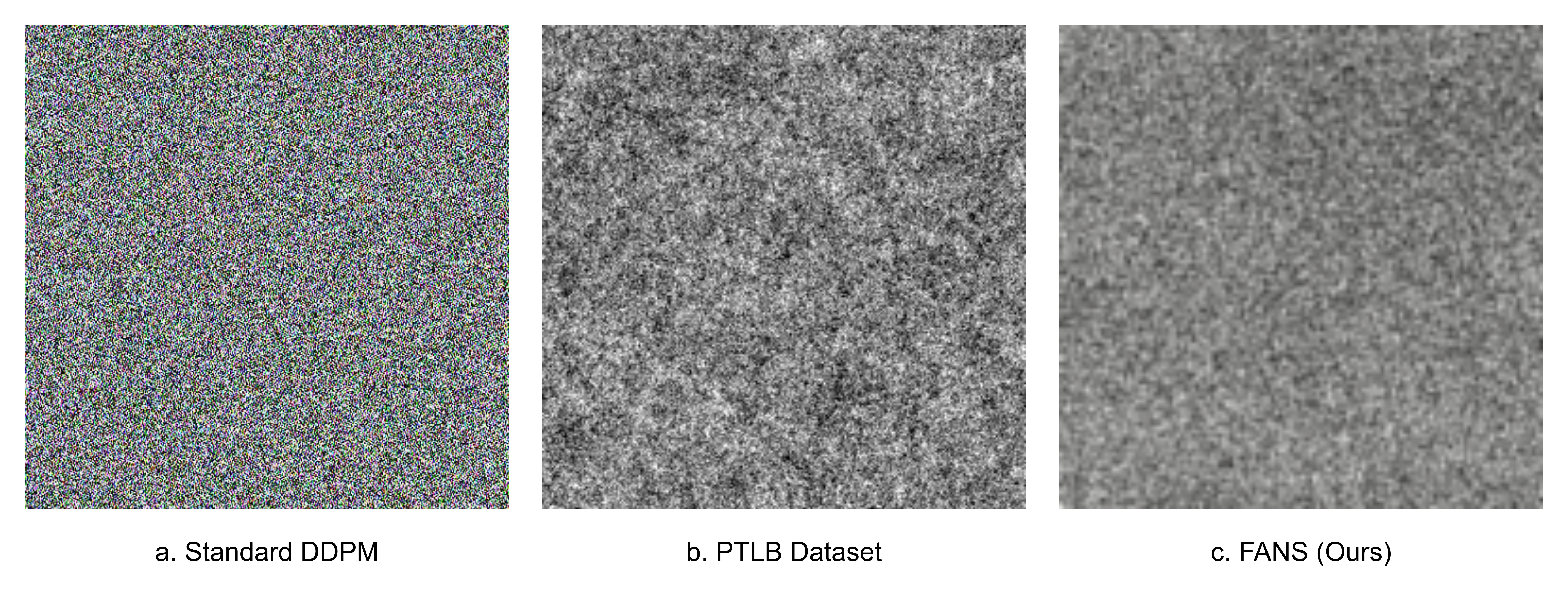 On PLTB, standard DDPM exhibits catastrophic failure, generating samples visually indistinguishable from Gaussian noise, while FANS produces recognizable structures matching the data distribution. Quantitative analysis shows DDPM samples have near-zero correlation with real data features.