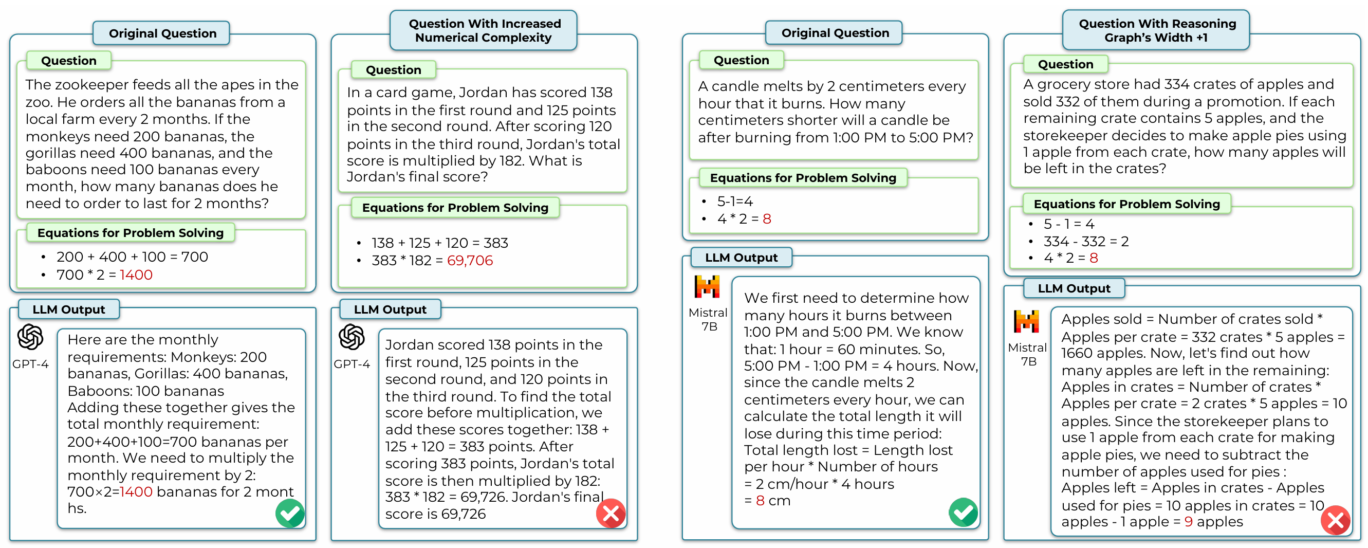 Figure 7: Case study from DARG. Left: Increasing numerical complexity causes GPT-4 Turbo to make calculation errors. Right: Increasing the width of the reasoning graph causes Mistral 7B to generate an incorrect reasoning process . This highlights how controlled variable manipulation in generative evaluation can isolate specific model failures.