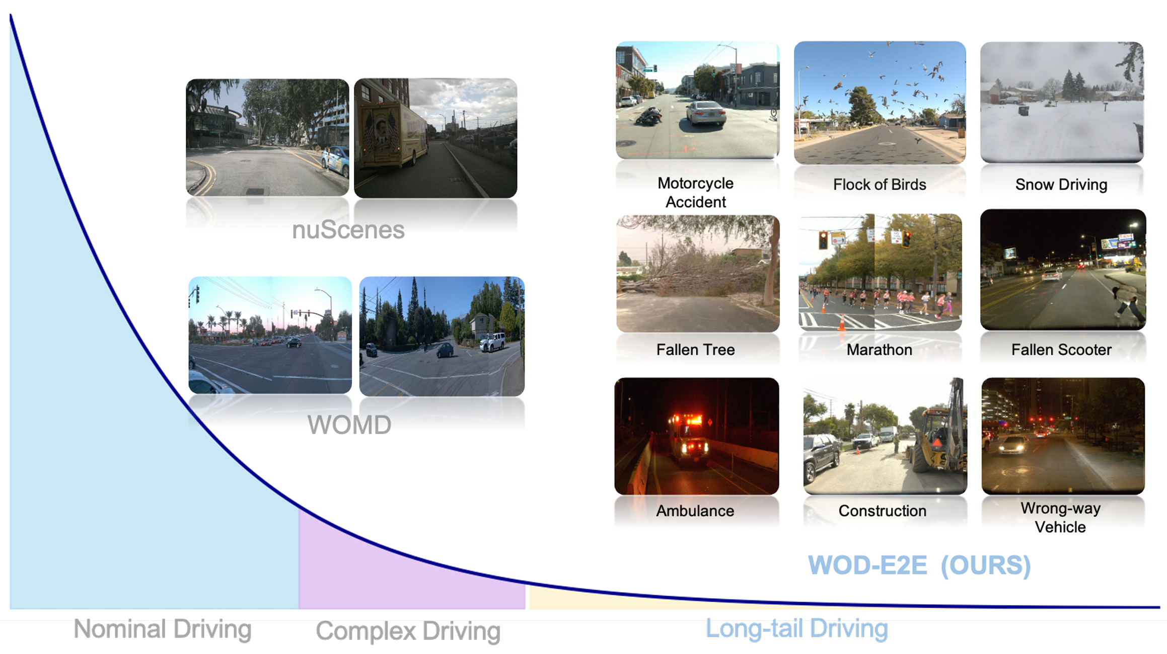 Static benchmarks typically mirror real-world data distributions, which makes them appear representative but also introduces a hidden bias: they underweight the most consequential failures. A substantial body of work documents that corner cases follow a long-tail distribution and are therefore extremely rare in collected logs . These rare events carry outsized safety impact so models can achieve high average performance on large static datasets while still failing catastrophically on corner cases. Empirical studies of autonomous driving quantify this sparsity: Waymo’s WOD-E2E dataset curates challenging long-tail driving cases and reports that such corner cases occur with frequency below $0.03\%$ in daily driving. Together these findings imply that static datasets will systematically underrepresent high-impact situations unless evaluation intentionally oversamples or emphasizes those corner cases.