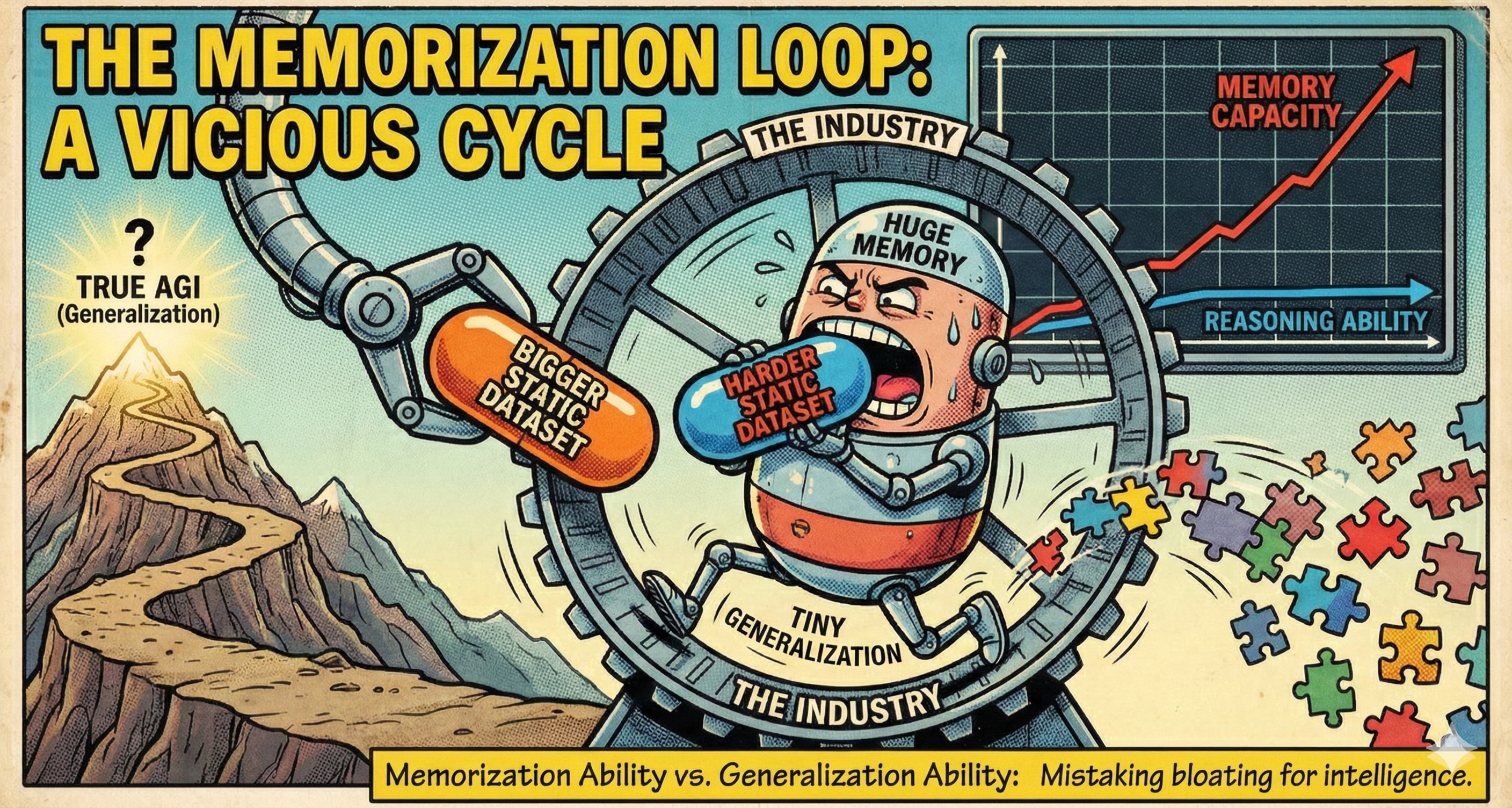 This points to an important issue: the fragility of models stems not merely from data or training limitations, but from systemic overfitting to the specific reasoning paradigms present in current static evaluations. Every time a static benchmark is “solved”, the field falls into a cycle: Propose a harder static dataset $\rightarrow$ Scale up the model to overfit the new structure pattern $\rightarrow$ Propose an even harder dataset. This is a race of “memorization capacity vs. reasoning ability.” We mistakenly believe the model is getting smarter, but it is often just expanding its capacity to memorize patterns, thereby missing the opportunity to discover genuine reasoning algorithms and moving further away from the goal of AGI. As a result, in real-world applications, models frequently fail when users introduce novel “reasoning patterns” that are simple for humans but inaccessible through memorization.
