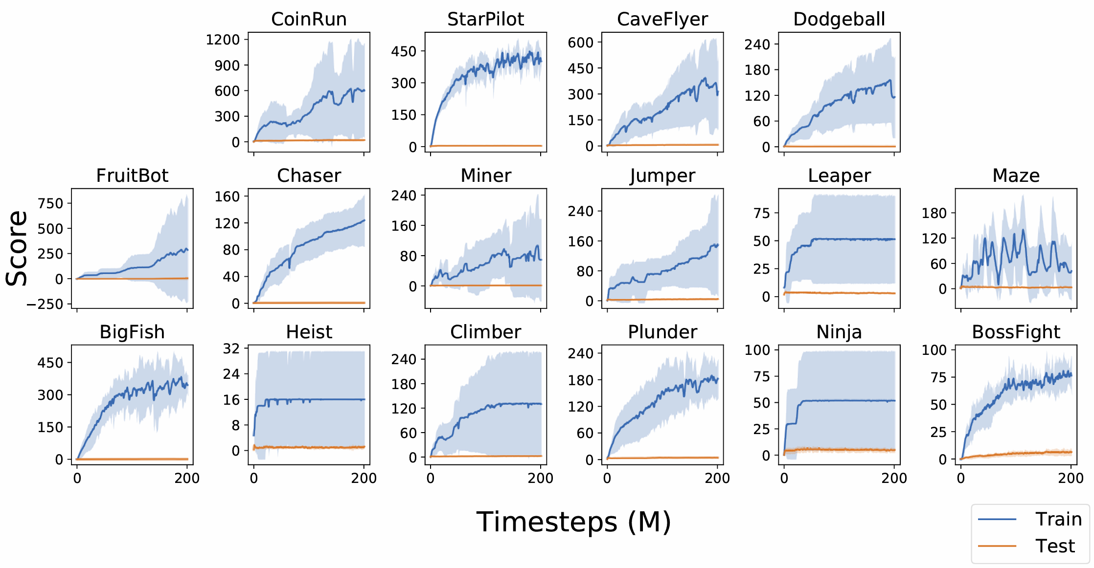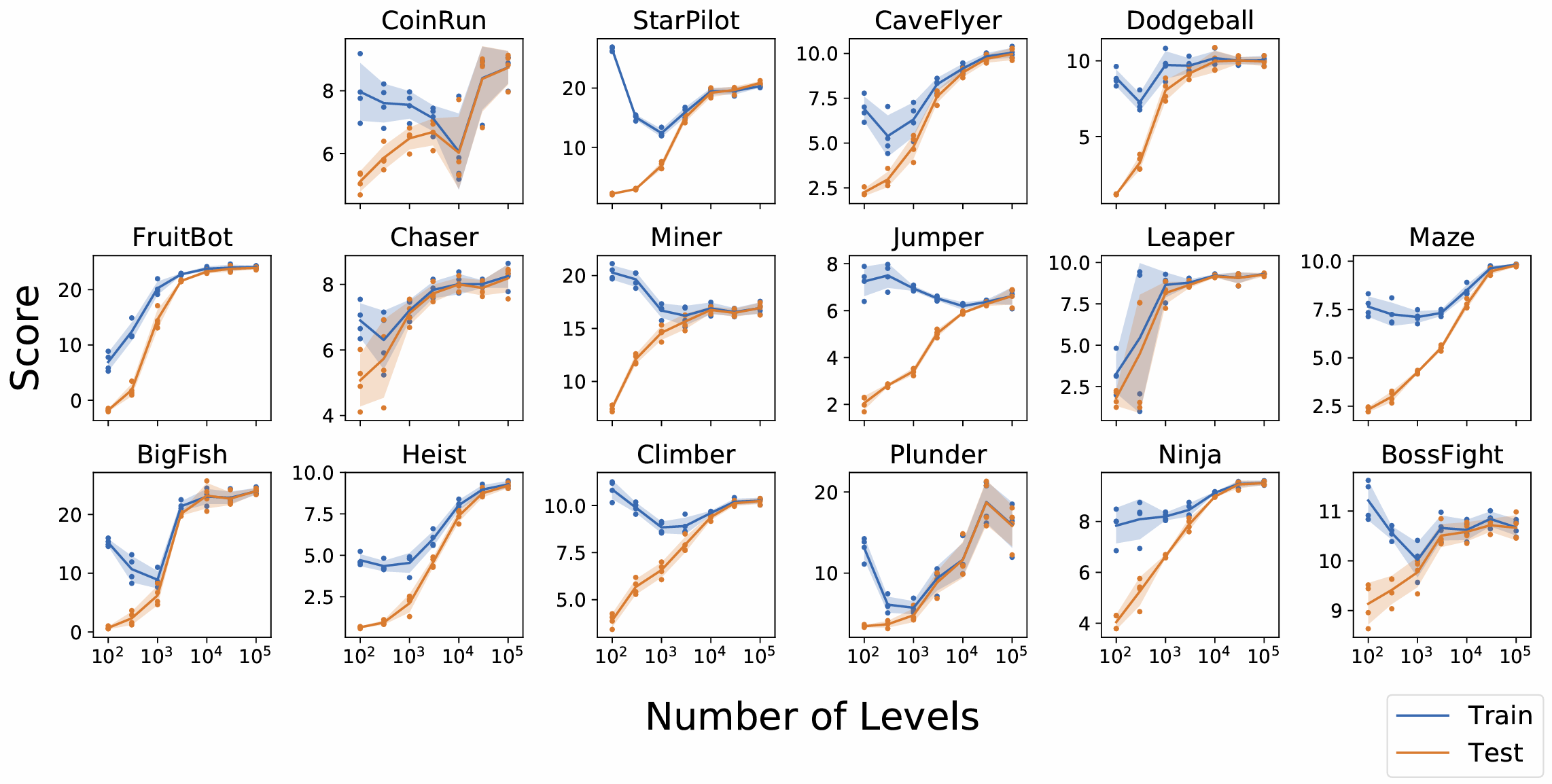 Figure 6. The Procgen benchmark expands intra-task diversity, increasing the state space to massive magnitudes (x-axis). As observed, only when the state space exceeds a certain threshold can we truly measure generalization performance (where training and testing curves converge) .