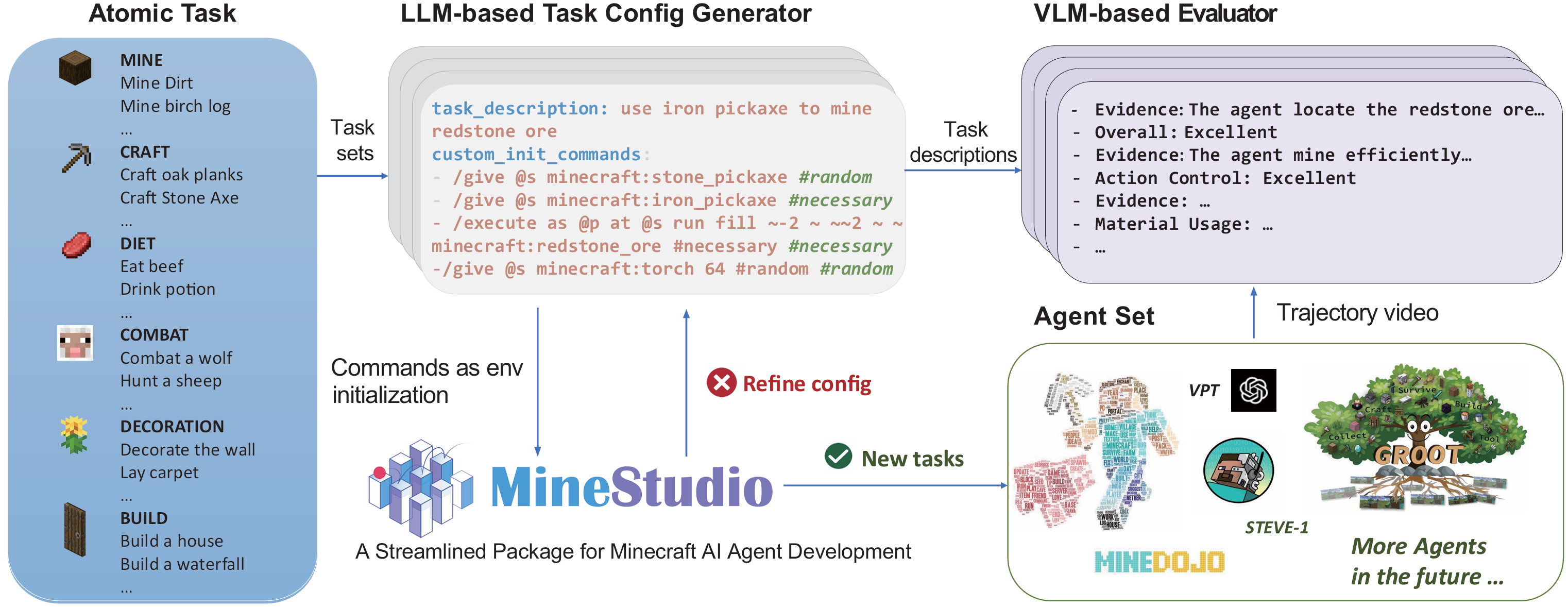 Simulator Verification: MCU utilizes the MineStudio simulator, a popular test bed for the Minecraft platform, as a ground-truth verifier. The LLM-generated initialization commands are executed in the game engine; if the engine throws an error (e.g., Spawning a mob type that doesn’t exist.), the system detects it and triggers a self-reflection loop to correct the initial configuration.