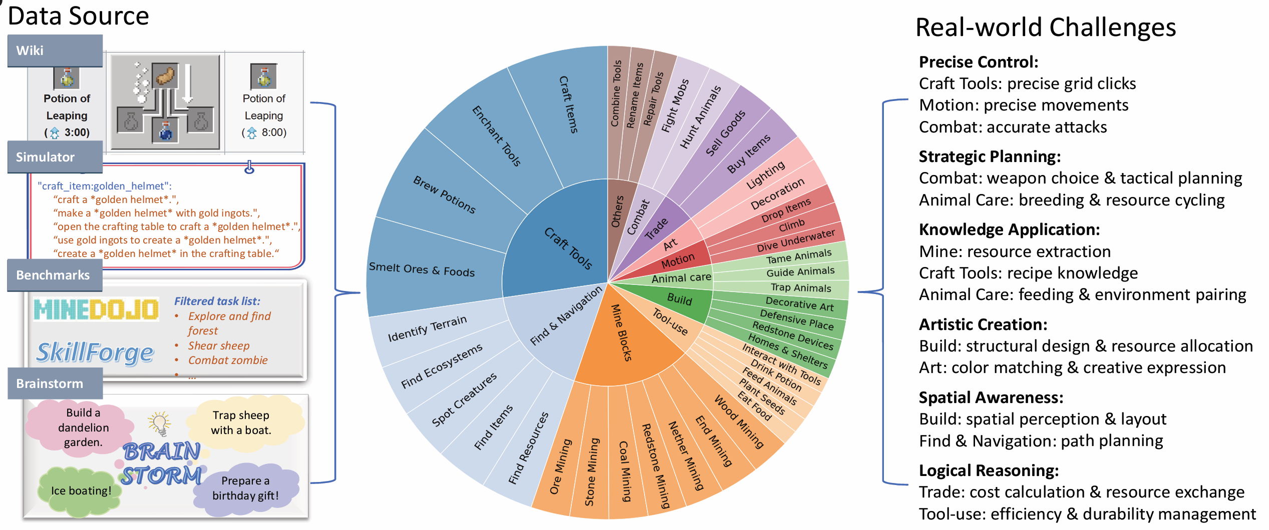Figure 5. The MCU task set is sourced from the Minecraft wiki, in-game data, existing benchmarks, and brainstorming sessions. It spans 11 major categories and 41 subcategories, ensuring high inter-task diversity. .