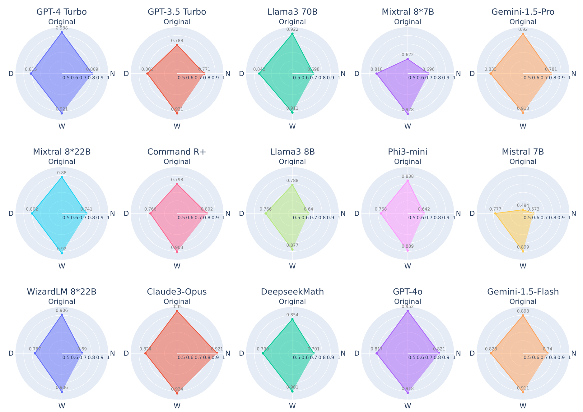 Figure 8. DARG visualizes the original accuracy of LLMs against their robustness across three complexity dimensions on GSM8K. 'N', 'D', and 'W' denote the CIARR for numerical complexity, depth, and width of the reasoning graph, respectively. .