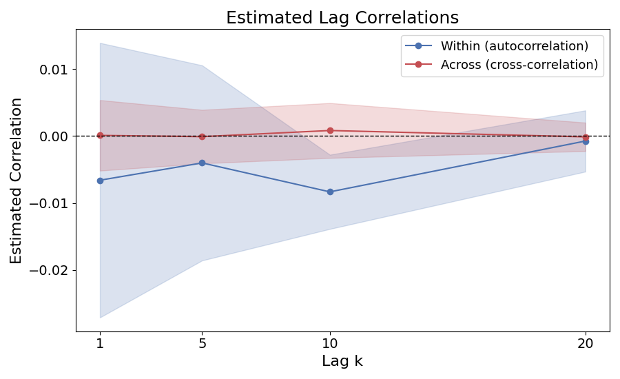 The covariance-based correlation is close to zero for all lags, although within-trajectory estimates show larger variation at small lags and approach the across-trajectory baseline as the lag increases. This suggests short-range dependence, but covariance-based correlation averages signed inner products, so positive and negative alignments can cancel in high-dimensional gradients. We therefore use the cosine correlation above, which normalizes each pair individually and better captures directional alignment between gradients. At a certain training update, we analyze gradient correlation at two levels: For a particular step in training, we compute following: